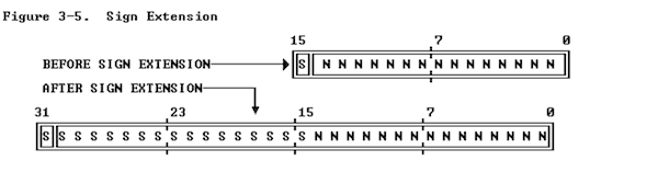 An illustration showing a 16-bit-to-32-bit sign extensions. "S" denotes sign bit. Source: https://www.scs.stanford.edu/05au-cs240c/lab/i386/s03_01.htm
